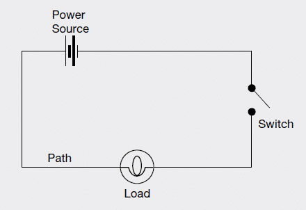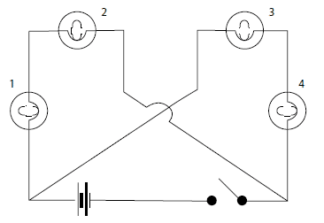 Questions regarding circuits usually follow a simple circuit as above, which will include: a power source, switches, bulbs and a path of wiring.