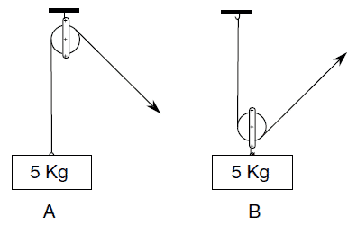 Explanation = when answering questions where there is a single pulley system, if the pulley is fixed, as in A, then the force required to lift the weight is the same as the weight, i.e. 5kg. However, where the pulley system is not fixed and it moves with the weight, as is the case with pulley system B, then the weight required to lift it is half the weight. This means that the weight required to lift B is 2.5kg. The answer to this question is therefore A, as pulley System A requires the most weight to lift it.