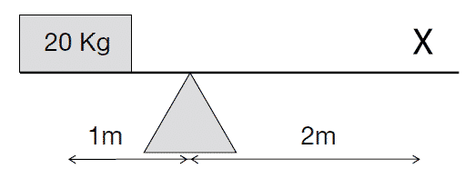 Explanation = Point X is twice the distance from the balance point. Therefore, half the weight is required. The answer is B, 10Kg.
