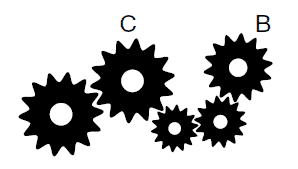 Explanation = if cog C turns anti-clockwise at a speed of 10rpm then it is relatively straightforward to determine that cog B will rotate the same speed but in a clockwise direction.