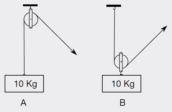 Diagram A = there is only one section of rope supporting the weight. Therefore, this can be worked out by just converting Kg to Newton: 10 x 9.8 = 98 N.
