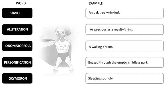 Anil needs your help. The poems use different literary techniques in their writing. Match the term up with the correct example.
